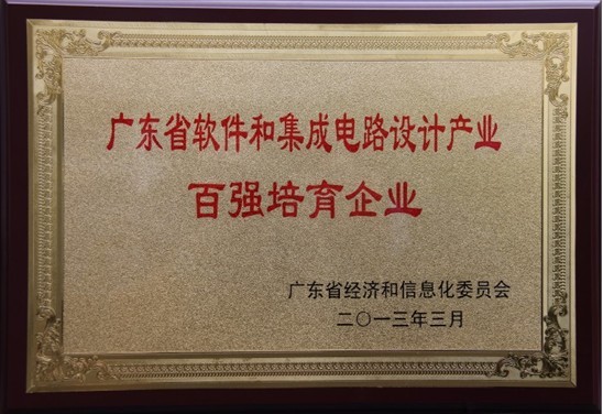 荣获2013年广东省软件和集成电路设计产业百强培育企业证书